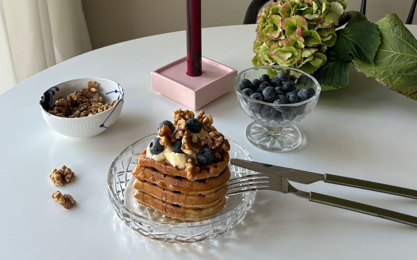 - Servér de lune vafler med vaniljeflødeskum, ahornsirup, blåbær og valnødder. Bon appétit!