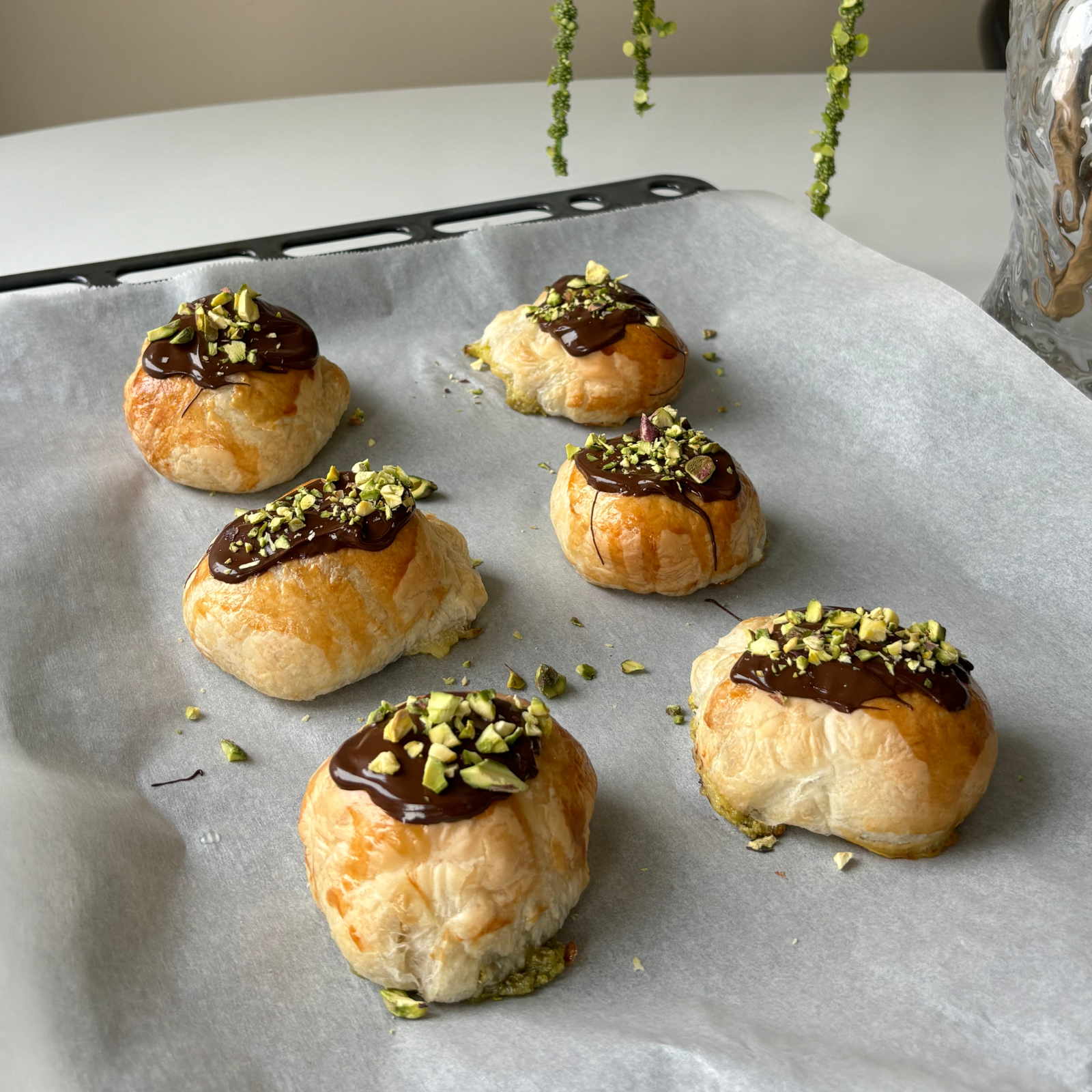 - Bag bollerne ved 200°C varmluft i 12-15 minutter indtil, at de er sprøde og gyldne. Lad dem køle let af, og pynt med smeltet chokolade og hakkede pistacienødder.