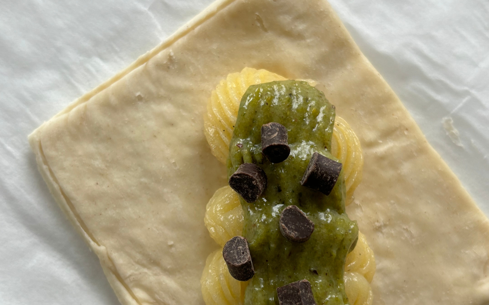 - Sprøjt først en lille mængde vaniljecreme i midten af hver firkant, og top derefter med en portion pistaciecreme fra en anden sprøjtepose. Du kan også bruge en ske.