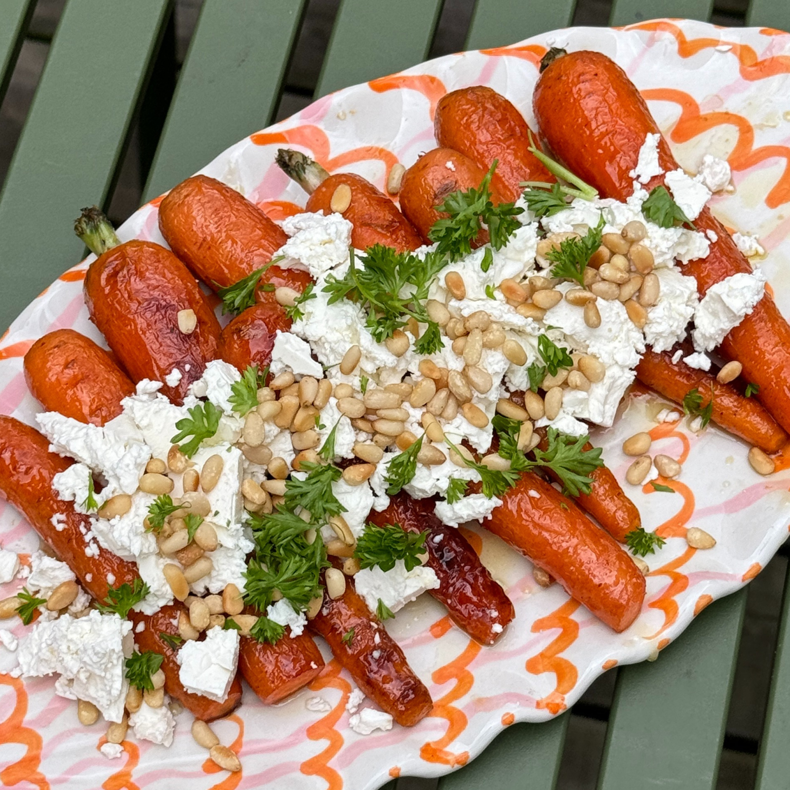 Dette twist med feta og pinjekerner giver en dejlig kontrast mellem de søde grillede gulerødder og den salte feta, mens pinjekerner tilføjer en skøn nøddeagtig smag og sprød tekstur.