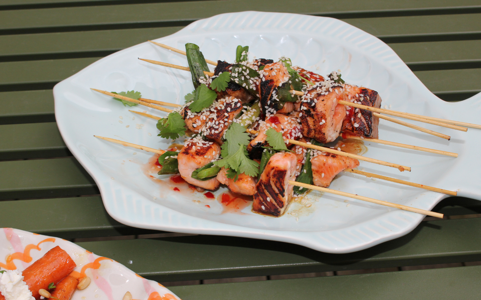 Fjern laksespyd fra grillen og anret dem på et fad.