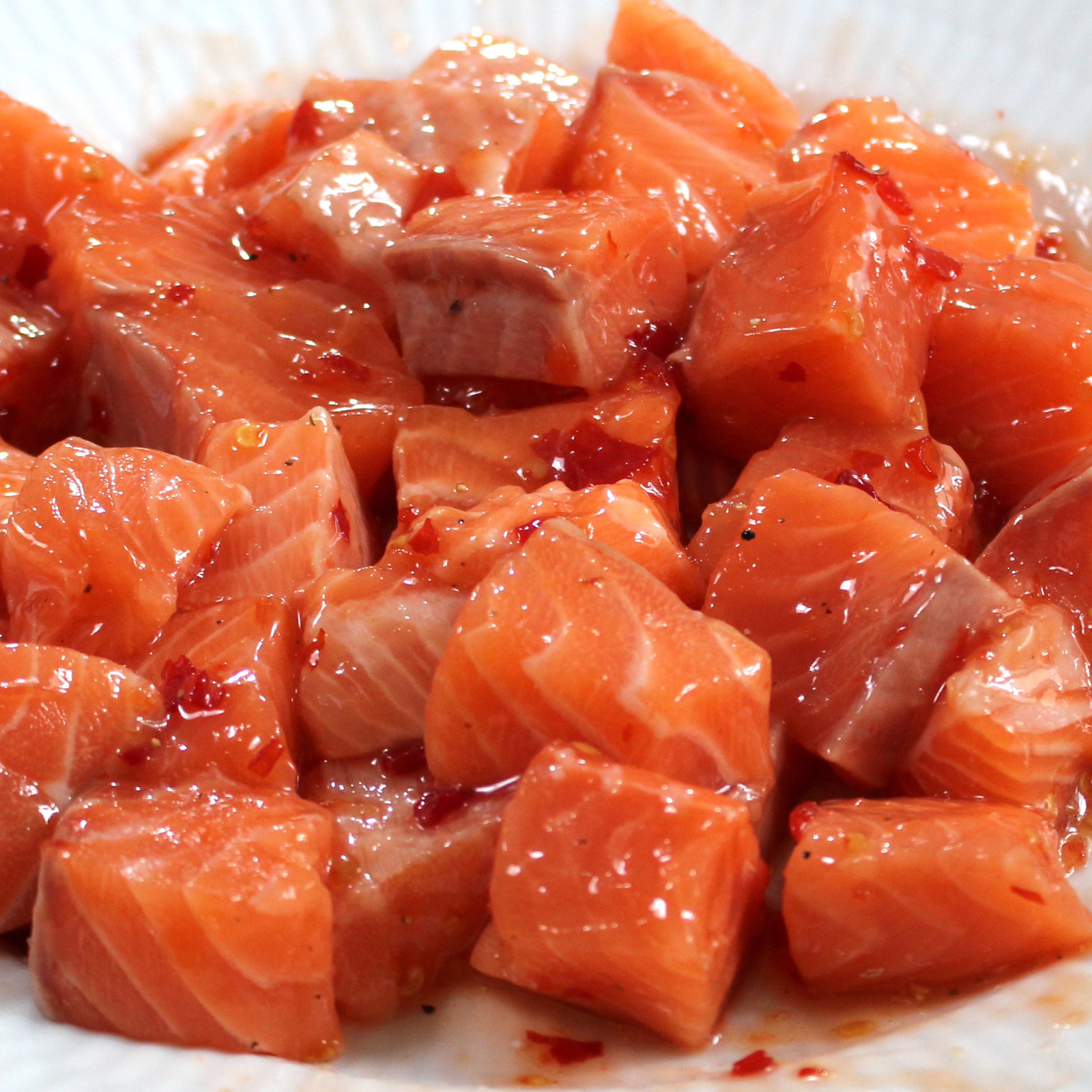 Skær laksefileten i mundrette stykker på ca. 3x3 cm.