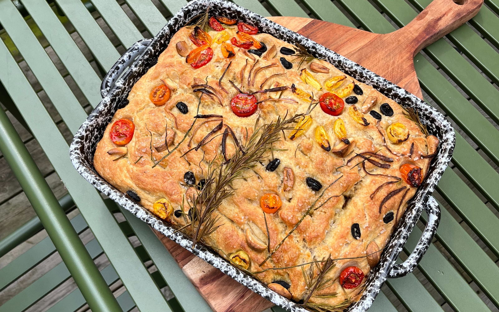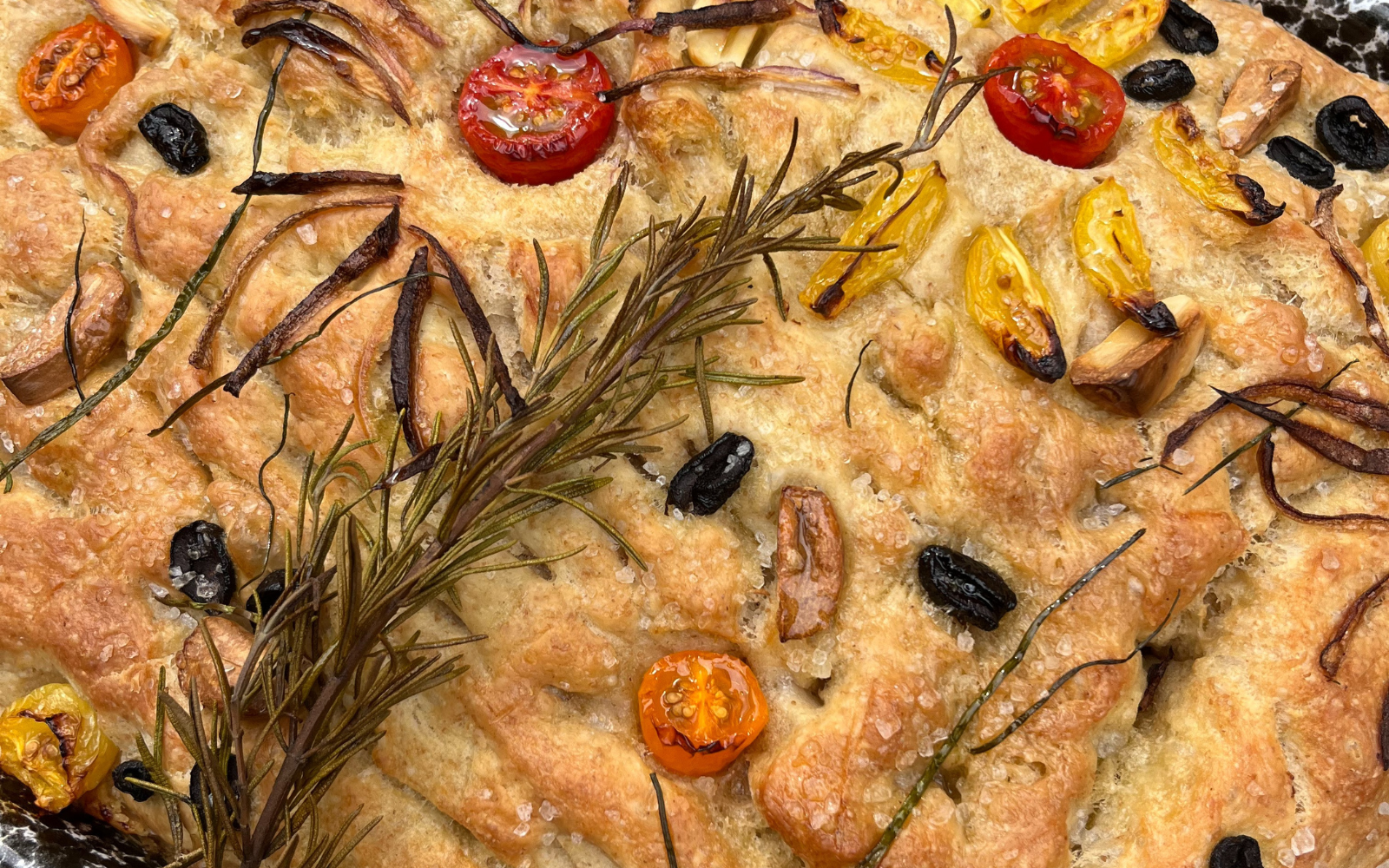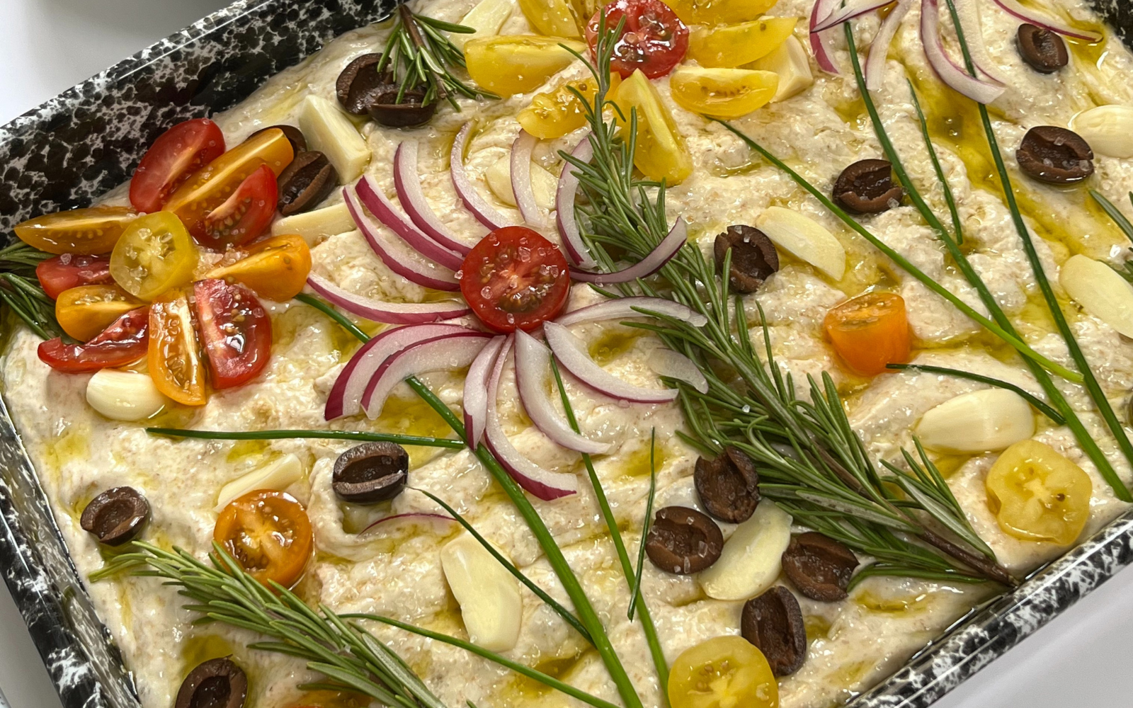 Tilføj nu dine favorit toppings. Vi har pyntet brødet med cherrytomater, oliven, hvidløg, frisk rosemarin og purløg. Til sidst drysses dejen med flagesalt.