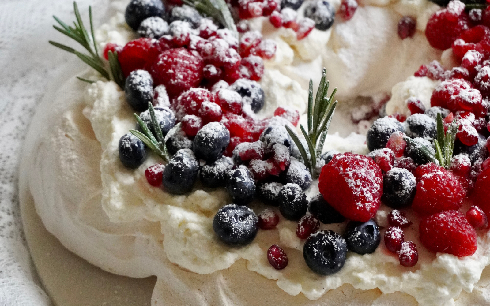 - Pisk fløden let til skum. Pynt derefter kransen med bær og drys efter ønske.