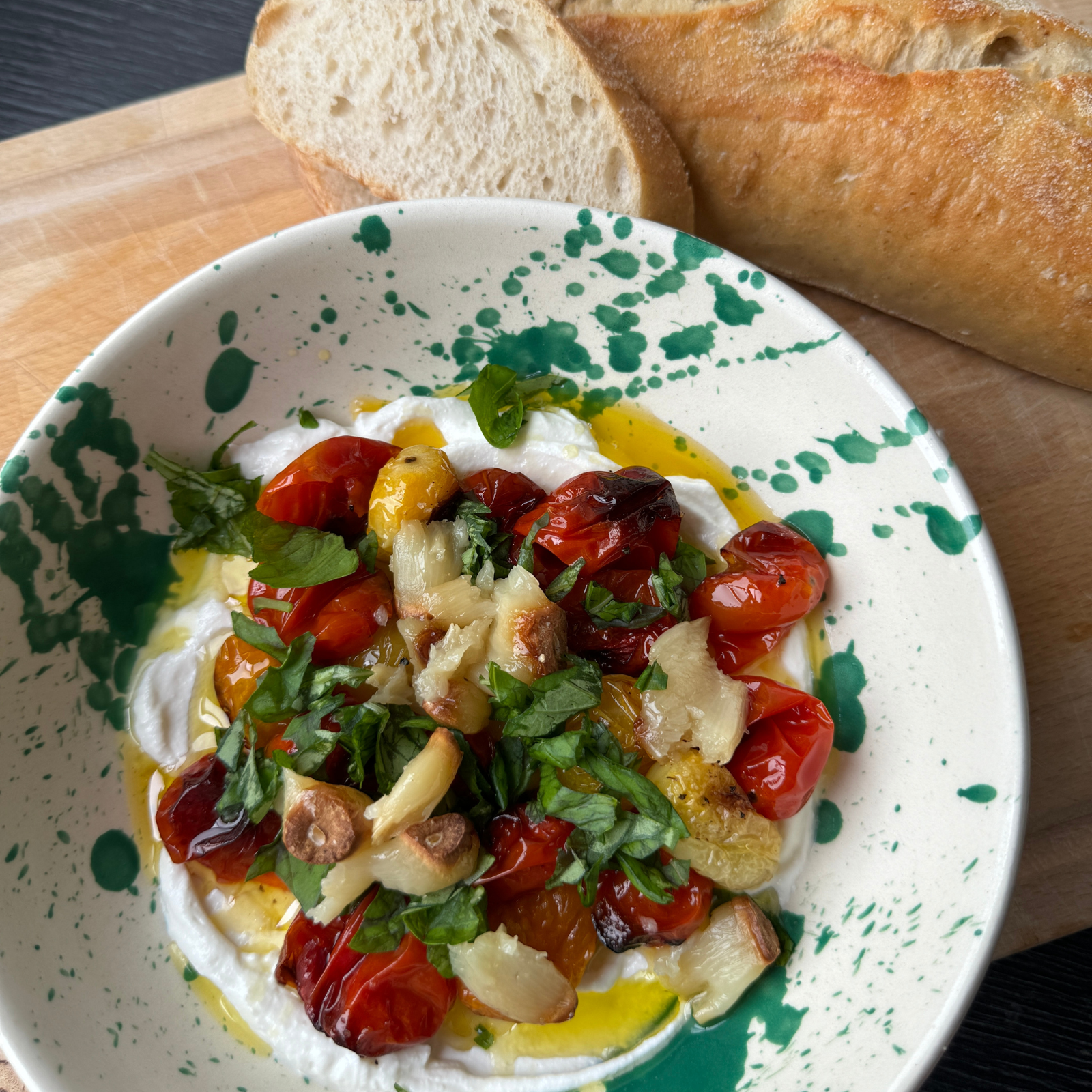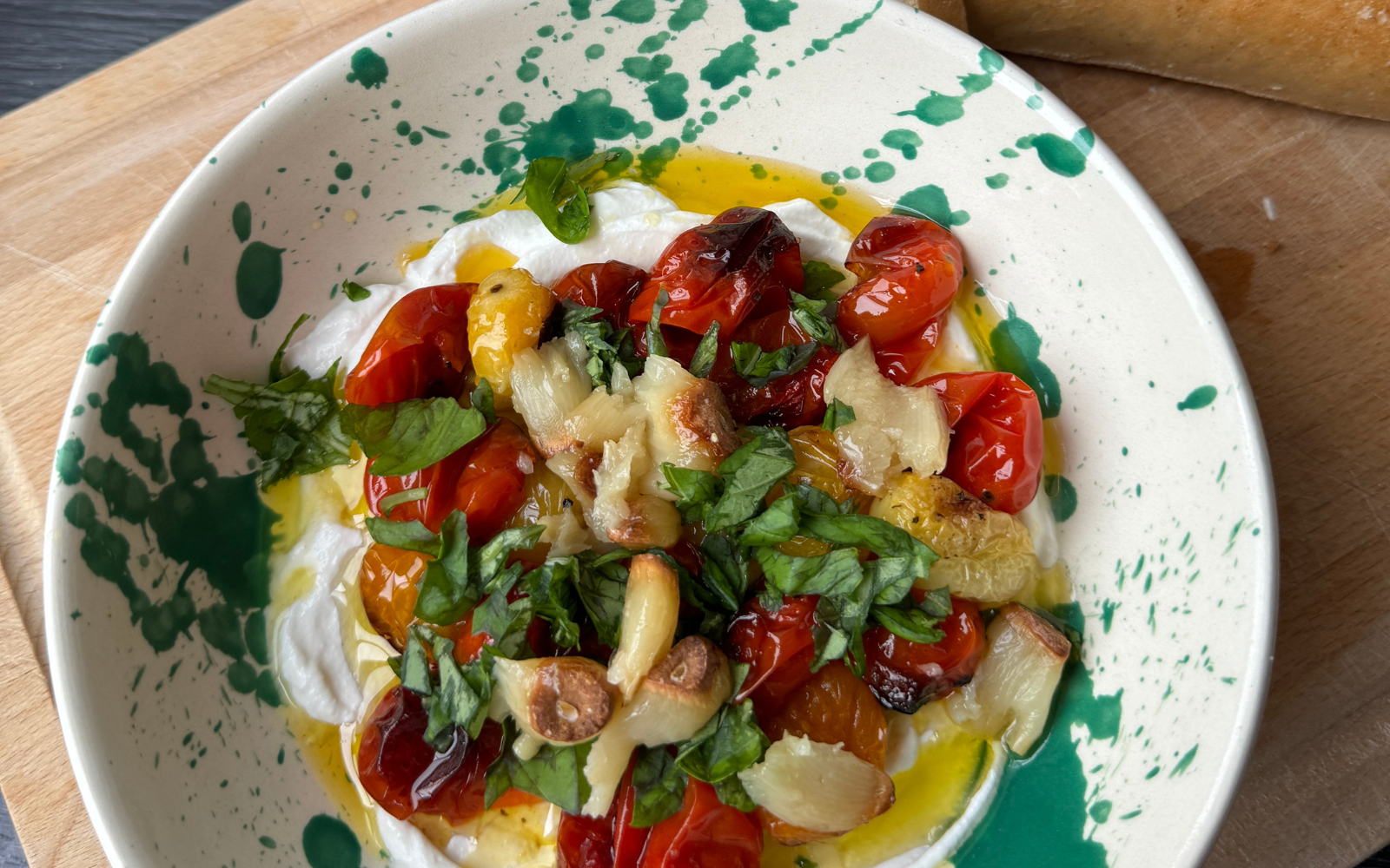 Placér de bagte tomater og hvidløg oven på ricottacremen, pynt med basilikum og salt og peber efter smag.