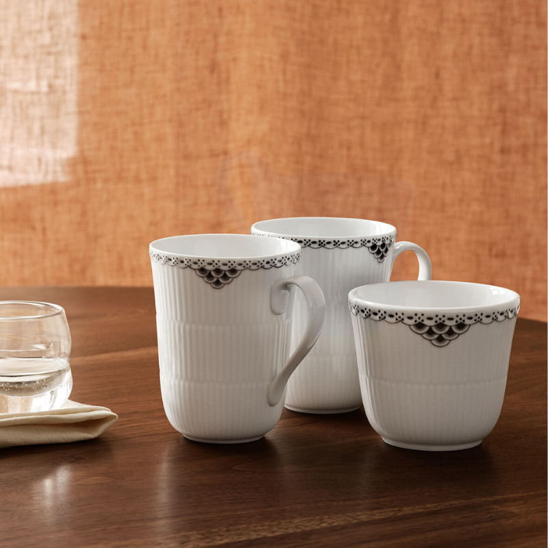 Dæk bordet med det smukke stel, som har det velkendte blondemønster malet i en blød koralfarve. Stellet er inspireret af Royal Copenhagens historiske farvearkiv.